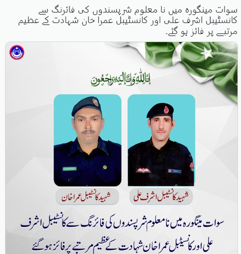 Both constables — Umra Khan and Ashraf Ali — were shot near Mingora’s Sabzi Mandi area in the morning hours, the police said, and were taken to a nearby hospital where they succumbed to their wounds.